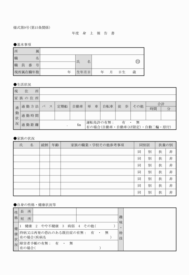 第15条 被評定者は、身上報告書(様式第9号)に自身を取り巻く環境、業務に関する所感等を記入し、評定者に提出するものとする。